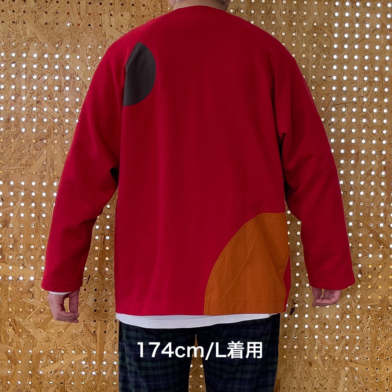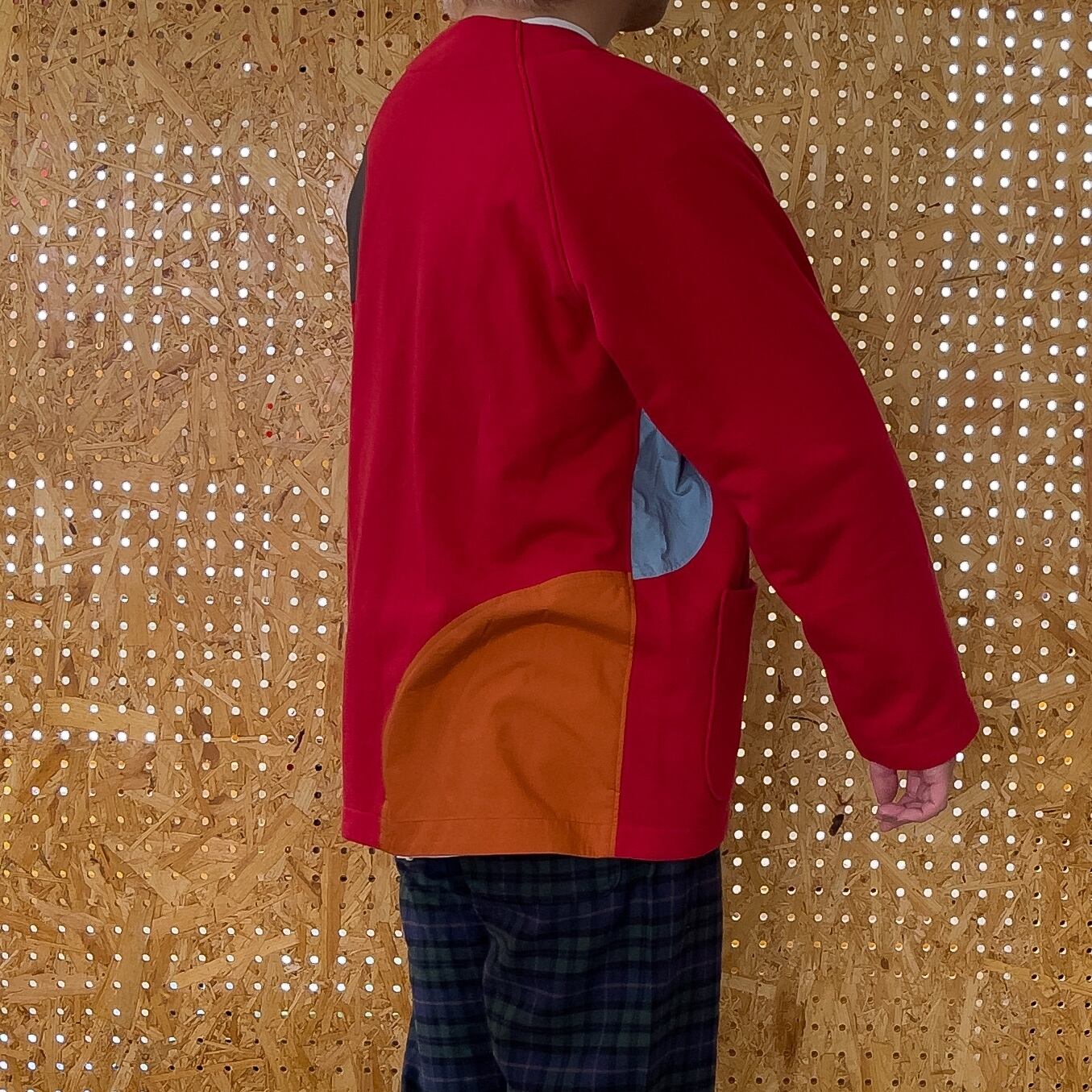 後ろ身頃に2カ所、前身頃の右横、左袖の肘部分に独特な密度とハリのあるタイプライタークロスという生地で丸形の切り替えを施していて程よいアクセントになっています。