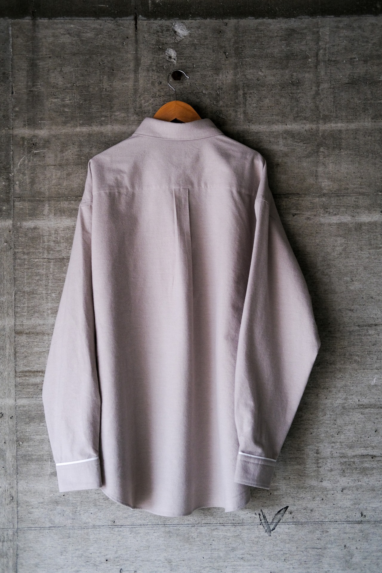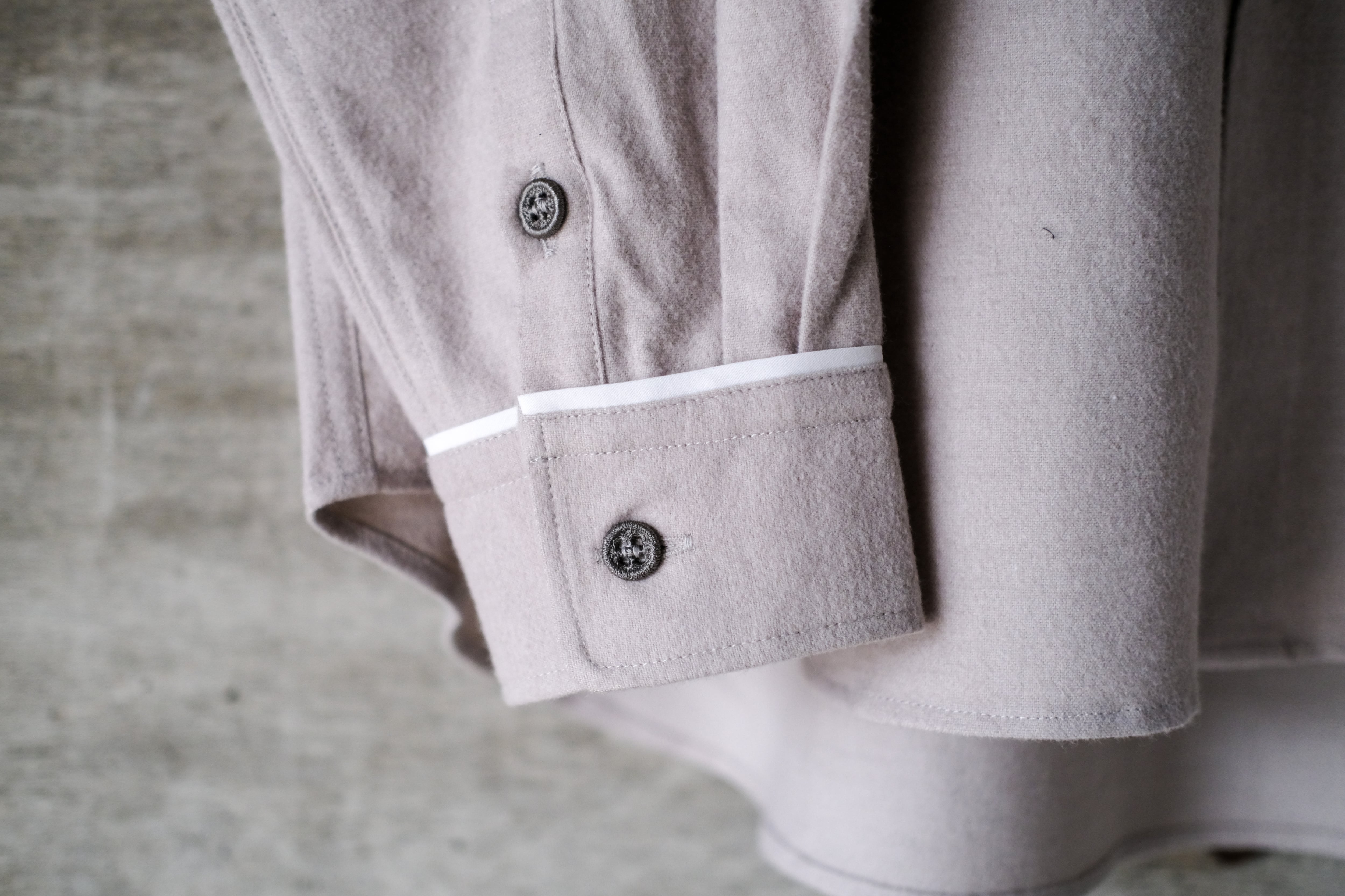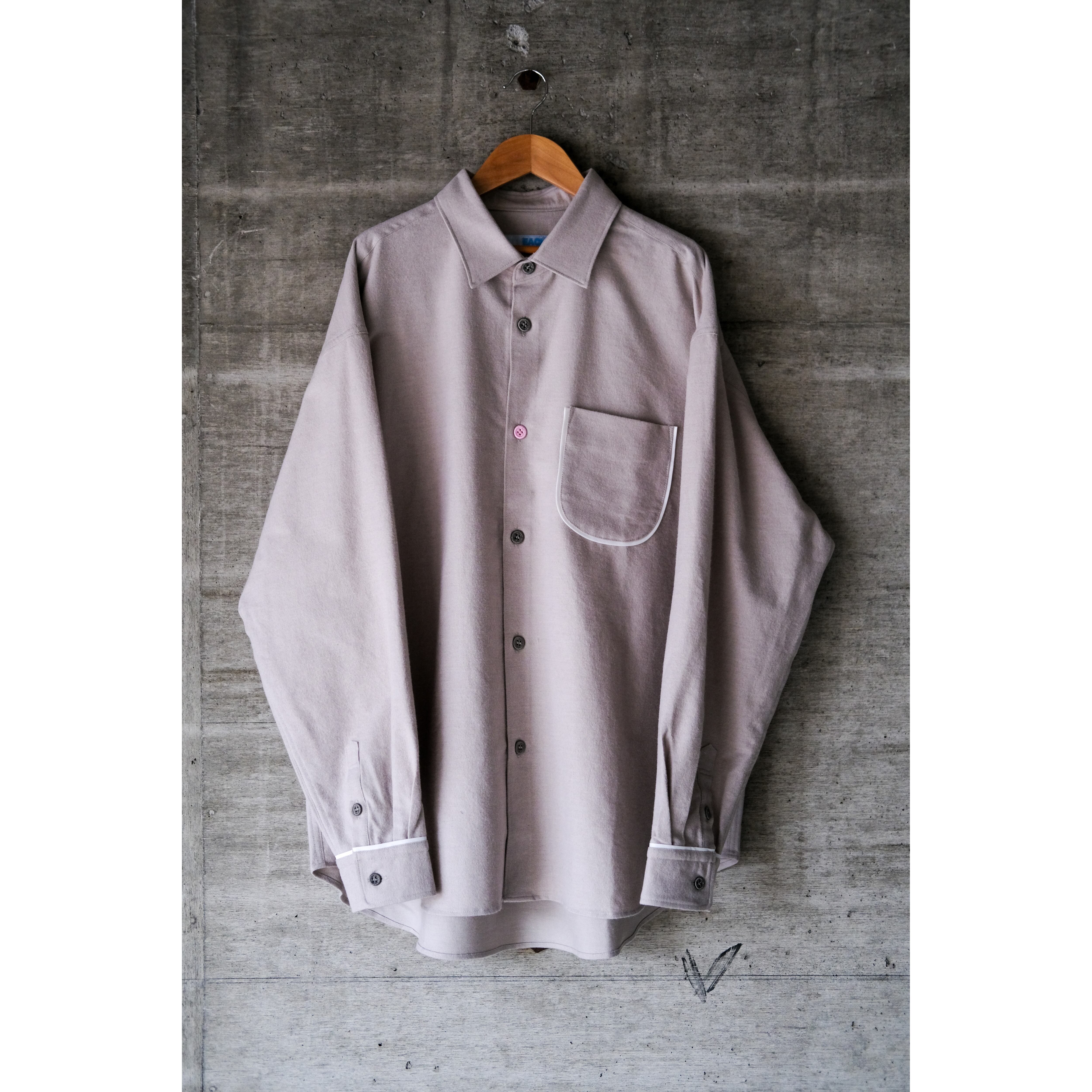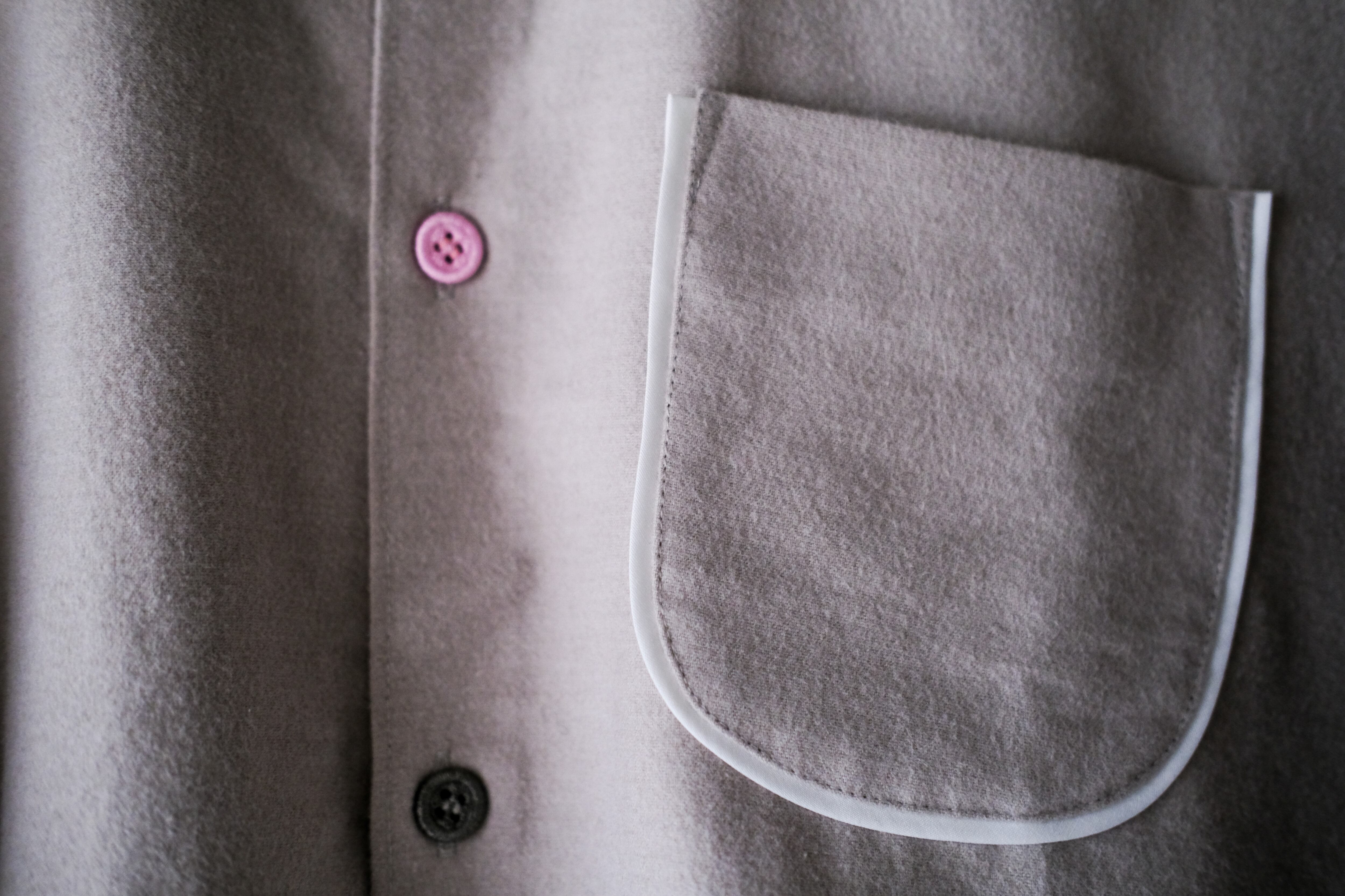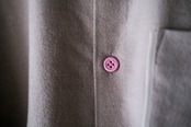 独特な風合いとポケット周り、カフスの付け根にパイピング、ボタンも刺繍糸で作られたボタンを使用し第3ボタンのみピンクで配色。